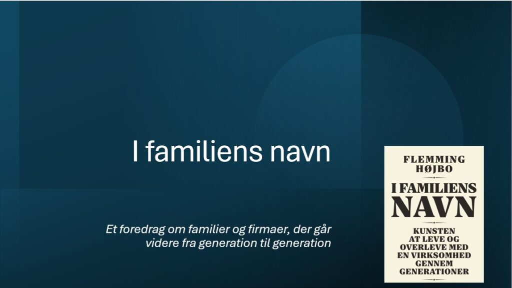 Med udgangspunkt i sin bog ’I familiens navn’ fortæller Flemming Højbo om kunsten at leve og overleve med en familievirksomhed gennem generationer. Det er en beretning om de tanker og følelser, der opstår i alle familier, men som får en ekstra dimension og betydning, når en familie ejer og driver en virksomhed. Og det er en beretning om, hvordan det lykkes nogen familievirksomheder at gennemføre det ene generationsskifte efter det andet.